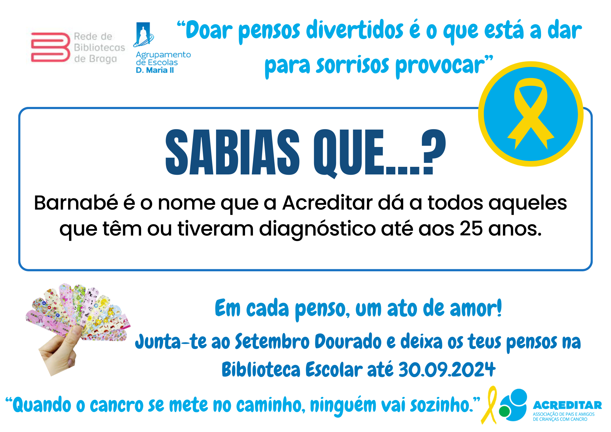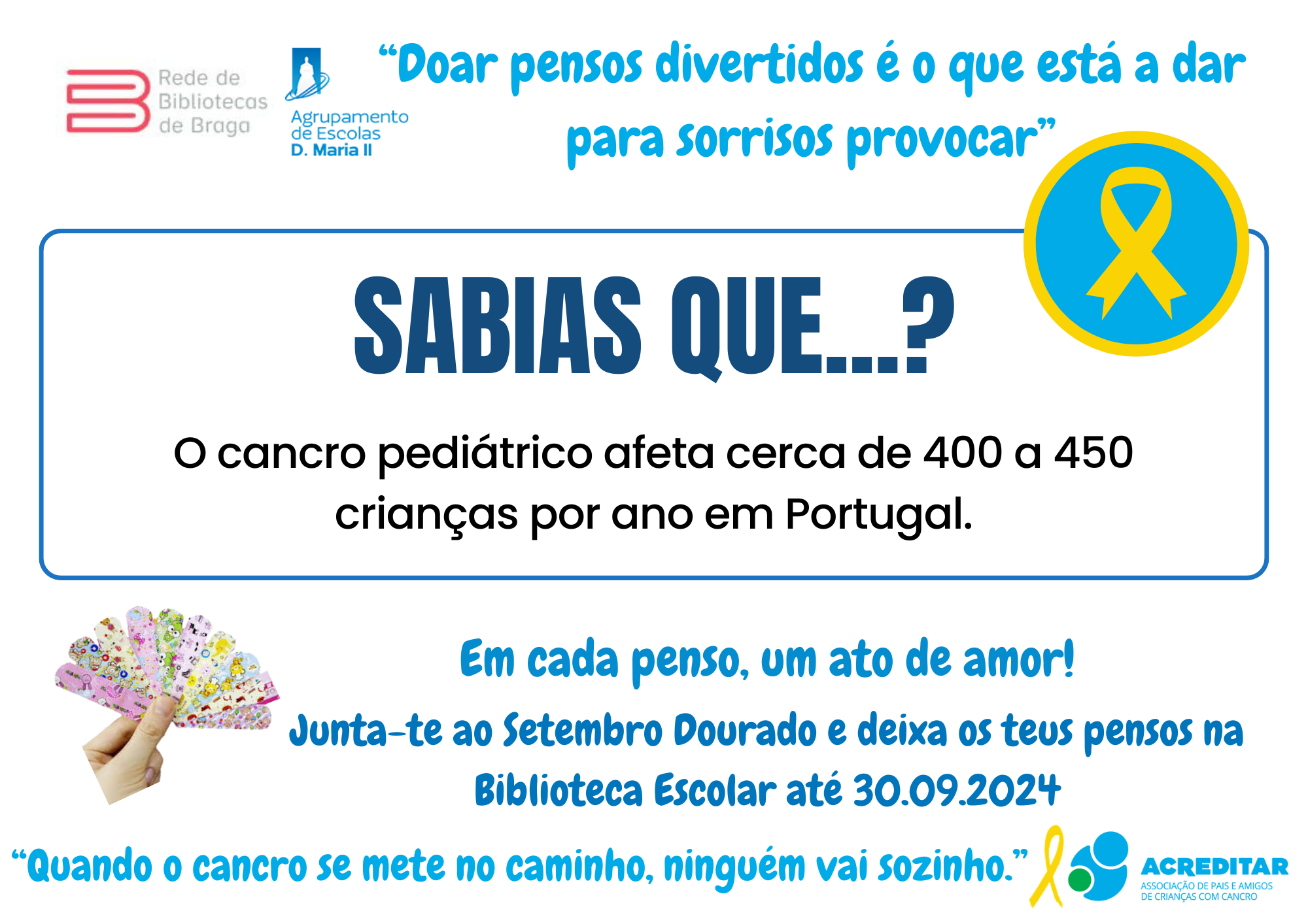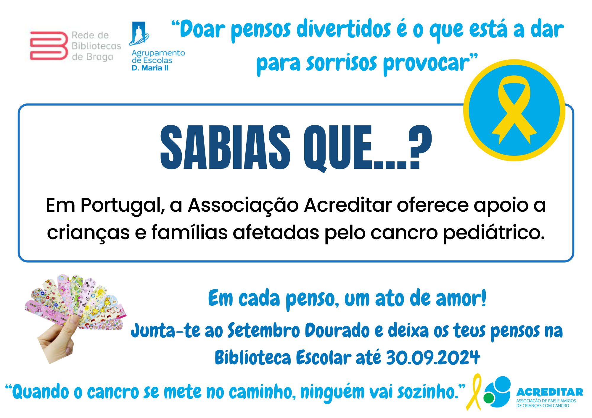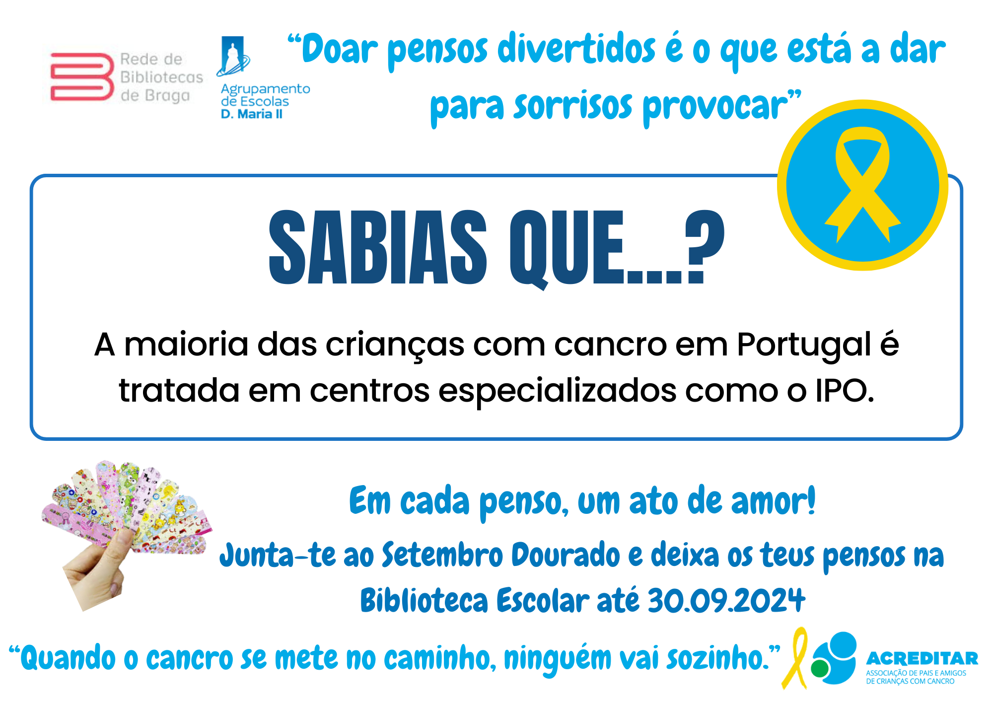 Assim, e sob o lema "Em cada penso um ato de amor", vimos apelar à vossa generosa e solidária contribuição com a doação do máximo número de pensos rápidos divertidos (com bonequinhos) para serem entregues à Associação Acreditar que os encaminhará para a ala pediátrica do IPO. Os pensos doados poderão ser entregues/ depositados numa das três Bibliotecas do AEDMII.