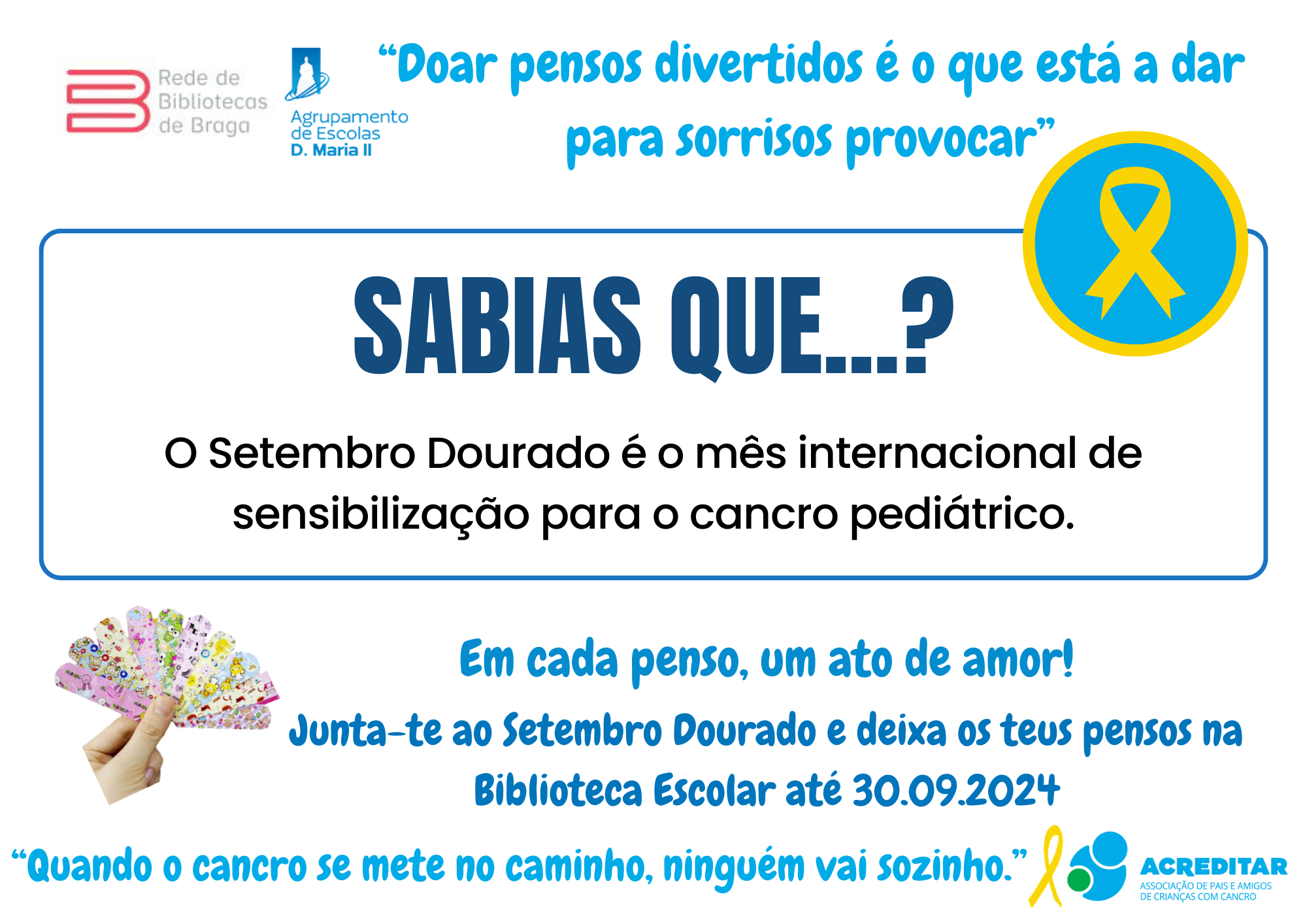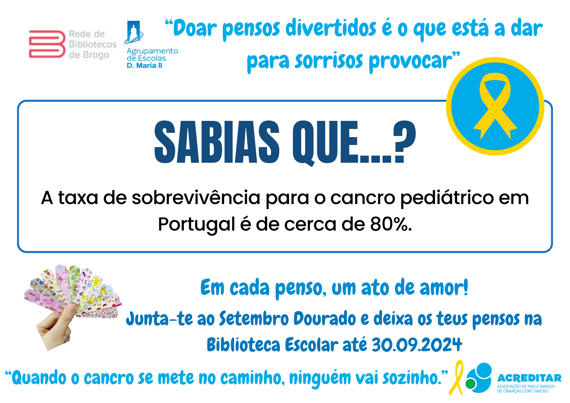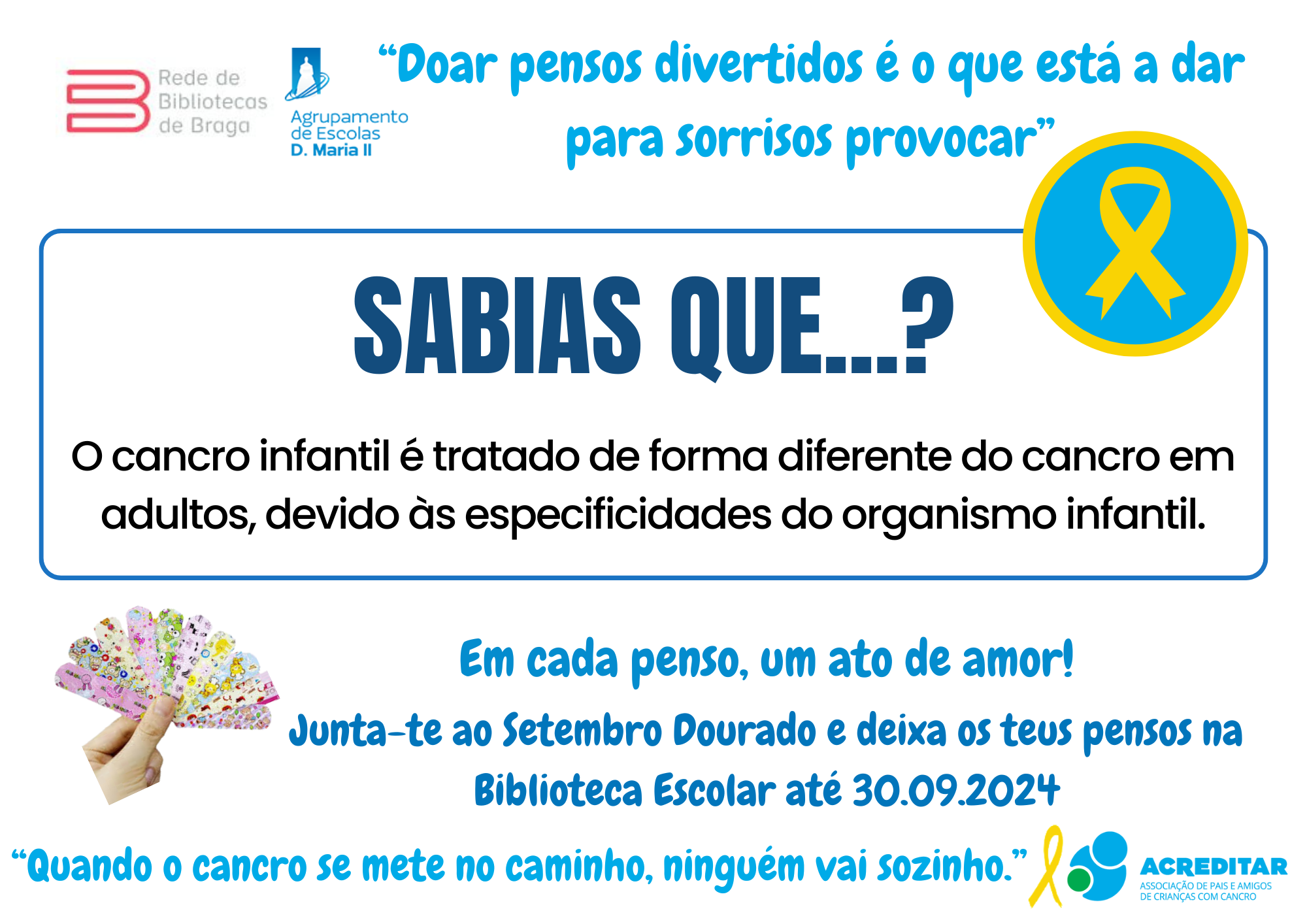 Assim, e sob o lema "Em cada penso um ato de amor", vimos apelar à vossa generosa e solidária contribuição com a doação do máximo número de pensos rápidos divertidos (com bonequinhos) para serem entregues à Associação Acreditar que os encaminhará para a ala pediátrica do IPO. Os pensos doados poderão ser entregues/ depositados numa das três Bibliotecas do AEDMII.