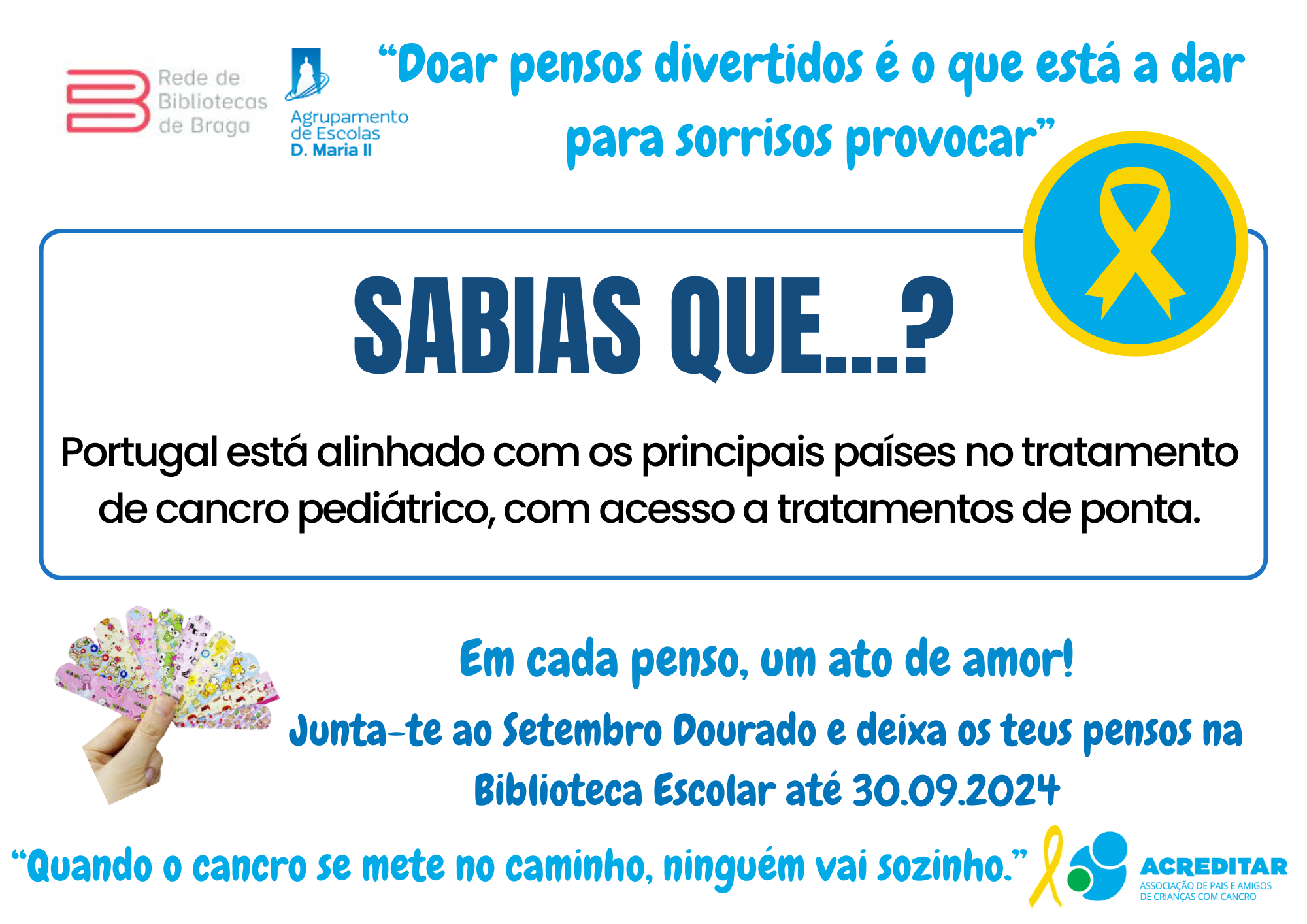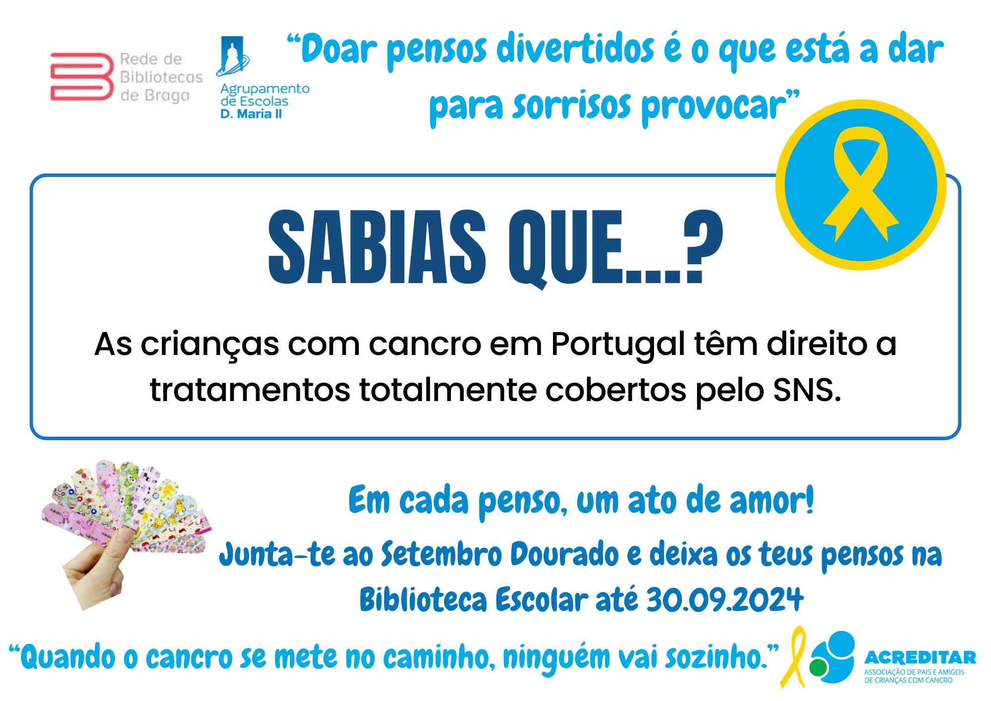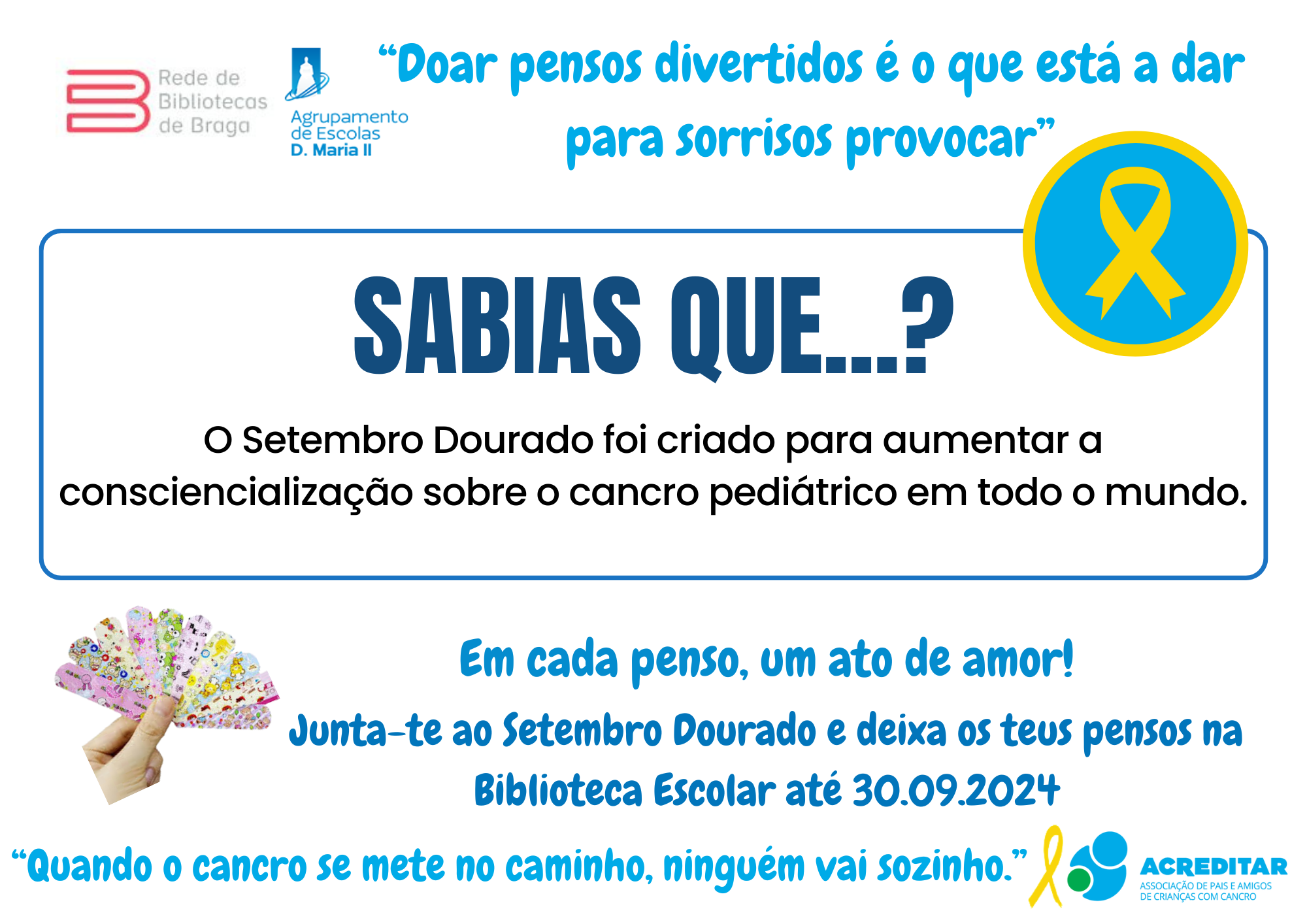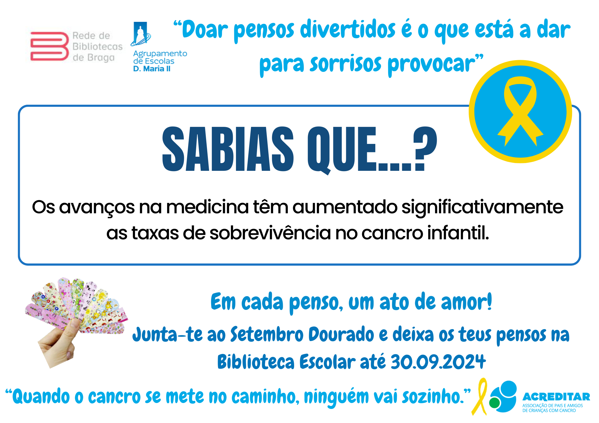 Assim, e sob o lema "Em cada penso um ato de amor", vimos apelar à vossa generosa e solidária contribuição com a doação do máximo número de pensos rápidos divertidos (com bonequinhos) para serem entregues à Associação Acreditar que os encaminhará para a ala pediátrica do IPO. Os pensos doados poderão ser entregues/ depositados numa das três Bibliotecas do AEDMII.